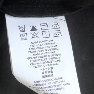 Shirt features an off the shoulder silhouette in black and button details in silver. Relaxed fit. Stretches across arms to stay in place.