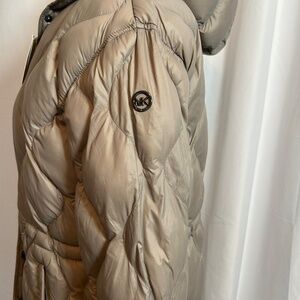 MICHAEL KORS packable taupe puffer coat. Size Small. Outer shell and lining are nylon. Arm pit to arm pit measures approximately 21". Comes from a smoke-free home.