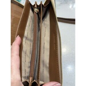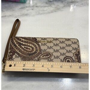 Elevate your style with this stunning Michael Kors wristlet wallet in a beautiful paisley pattern. Crafted from high-quality leather, this wallet comes in a trendy brown and tan color that is perfect for any occasion. The zip-around feature ensures that all your essentials are secure, while the strap and zipper accents add a touch of elegance.