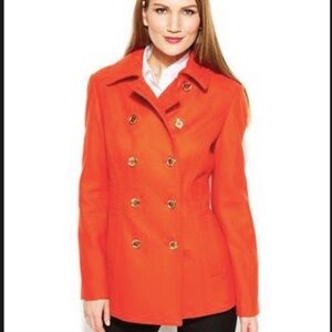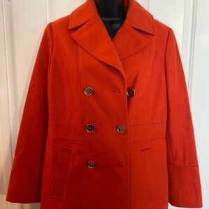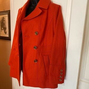 Effortlessly chic double breasted, wool blend, dark orange peacoat with gold logo button accents. Notched lapels. Front angled pockets. Flattering feminine silhouette cut/fit.