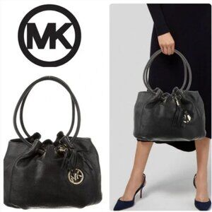 Authentic Michael Kors Bucket Bag. Luxe buttery-soft pebbled leather bucket/tote bag, designed with a ruched/pleated cinch style top and oversized o-ring handles, accented with leather tassel and gold MK logo emblem. Offers a spacious main compartment with four open sidewall pockets and one zippered wall pocket.