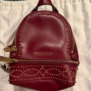Compact Michael Kors backpack in deep red leather. Gold-tone studs form decorative patterns. Front zip pocket with polished gold hardware. Top handle and adjustable straps for easy wear.