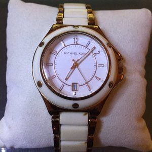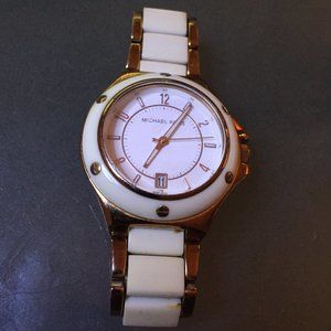 Model MK-5261. Rose gold-tone and white acrylic case with a rose gold-tone and white acrylic bracelet. Fixed white acrylic bezel with rose gold-tone trim. White dial with gold-tone hands and alternating stick and Arabic numeral hour markers. Minute markers around an inner ring. Luminescent hands and markers. Date display at the 6 o'clock position. Quartz movement. Scratch resistant mineral crystal. Textured rose gold-tone crown. Water resistant 10 ATM. Fits size 6 3/4" wrist. (No extra links).
