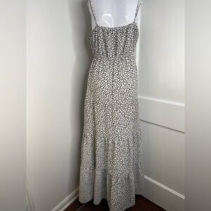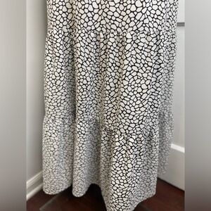 This stunning Michael Kors sundress features a tiered design in a beautiful black and white color palette. With its sleeveless spaghetti strap neckline, this maxi dress is perfect for wedding guest attire or a casual resort wear look. The flowing silhouette and delicate floral print add a touch of elegance and femininity. Pictured AS IS