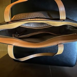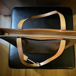 Michael Kors Tote Purse. Coated canvas and leather. The dimensions are 9" tall, 15" wide at the top. 10" wide at the bottom. 6" side width. Like new, never used. No longer needed.