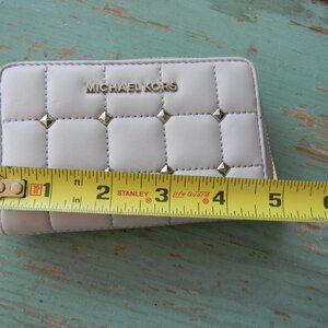 MICHAEL KORS SMALL GRAY STUDDED QUILTED LEATHER WALLET ZIP AROUND, GOOD USED CONDITION. SOME VERY SMALL OVERALL SIGNS OF WEAR.