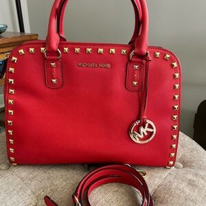 MICHAEL KORS Sandrine Gold Studded Satchel Shoulder Bag/Purse Red