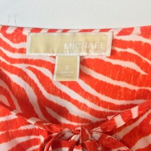 Silky flowy poncho top with zebra orange print & embellished tie front. Tunic kimono style with split neckline & elastic stretch waist.