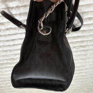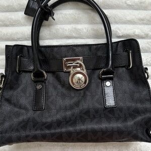 Hamilton signature black shoulder bag. Handbag with saffiano leather. Michael Kors MK monogram logo on leather