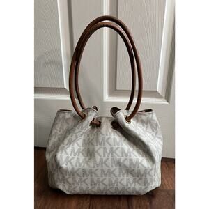 MICHAEL KORS Signature Canvas Leather Tasseled Ring Bucket Tote with BONUS