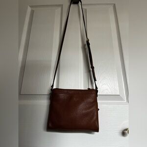 used (good condition) MICHAEL KORS brown leather cross body // adjustable buckle leather strap and has a card holder compartment // perfect for travel