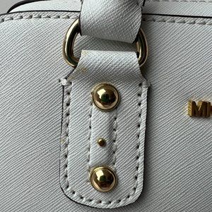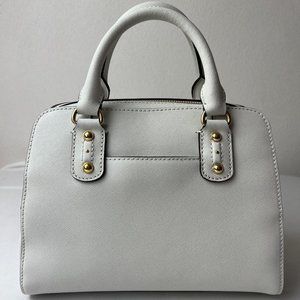 MICHAEL KORS Small Saffiano Optic White Satchel Purse w/ Shoulder Strap. Used only on special occasion. Condition is great, although there is a tiny discoloration near bottom of hand strap as seen in picture 4.
