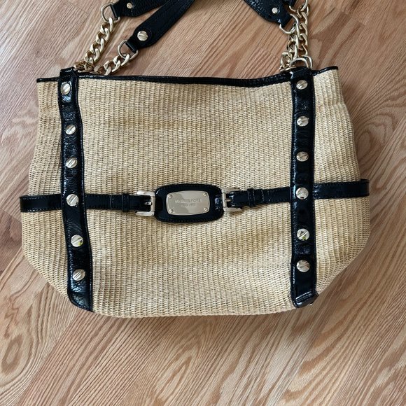 Gently used. Elevate your style with this chic satchel bag from Michael Kors. The bag features a woven rattan exterior with black leather trim and gold-tone hardware accents, giving it a bohemian vibe. It is spacious enough to hold all your essentials with inner pockets for organization. The double handles provide easy carrying, making it perfect for travel, weddings, parties, casual outings, and even workwear or business occasions. The magnetic closure keeps your items secure. This medium-sized bag is a must-have addition to any designer collection.