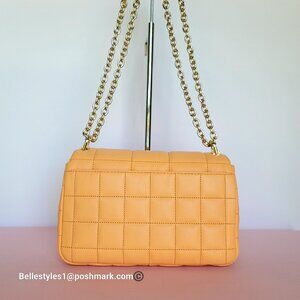 BRAND NEW WITH TAGS. Cantaloupe color. An allover soft quilting leather bag with enough room for your small essentials with interior pockets for easy organization and flap-over with push-lock closure. A chain strap adds versatility to this bag to wear as crossbody, or the strap can be double-up for shoulder wear. Crafted from soft smooth quilted leather for sophistication. Features a back slip pocket with magnetic-snap closure for added storage and easy access.