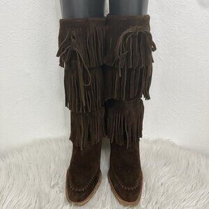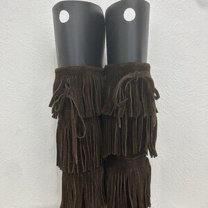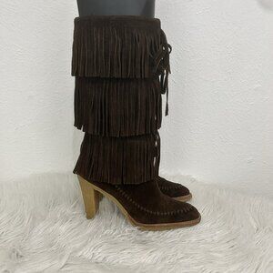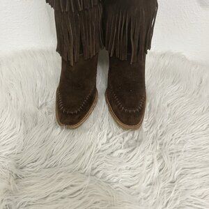 MICHAEL KORS Suede Boots Fringe 6.5 M Brown High Heel Almond Toe Boho Festival