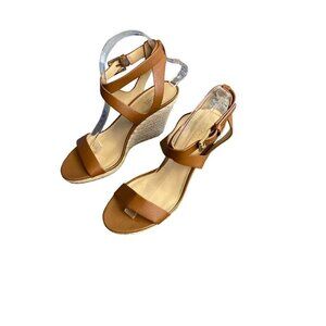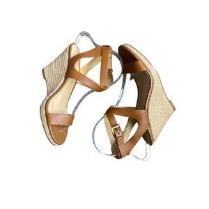 MICHAEL KORS TAN LEATHER ANKLE STRAP OPEN TOE WEDGE SZ 7.5