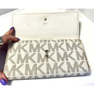 MICHAEL KORS TRAVEL LARGE TRIFOLD WALLET CLUTCH VANILLA MK SIGNATURE w/ Gold Pen