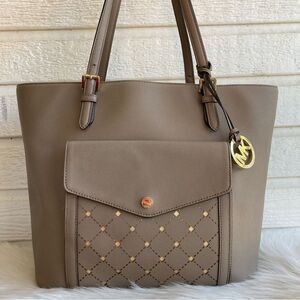 MICHAEL KORS Tan Grey Leather Perforated Pocket Jet Set Tote