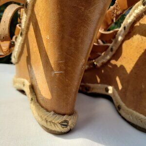 Good Condition. Slight scratches on wooden heels. Brown stain on the left shoe. Please view ALL photos for details.