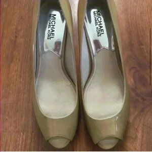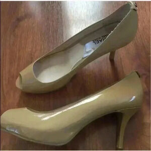 Michael Kors Tan Peep toe heels! Excellent condition minus scuff on right side. Patent leather! Great for any occasion! Heel height approximately 3.25”