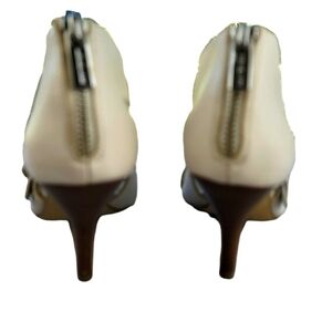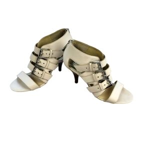 MICHAEL MICHAEL KORS Tripple Buckle Open Toe Leather Upper Pumps, Back Zip Closure, Pumps/Sandals in Off White, 3.5" Heel, Silvertone buckle and zipper hardware, toe strap, previously owned, discoloration see pics 12 & 11, good condition