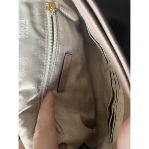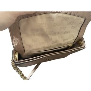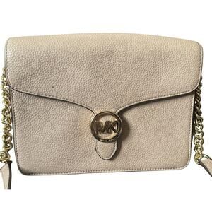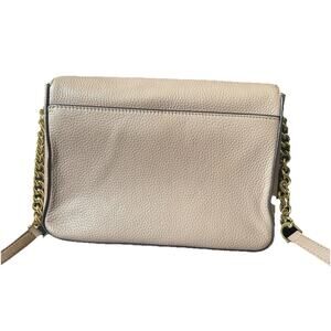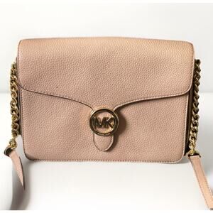 This is a Michael Kors Vanna Medium Shoulder Flap Crossbody bag for women, featuring a pebbled leather exterior in a Blossom color. It is designed with the Pebbles character and has a sleek and stylish finish. Perfect for carrying essentials in a chic and organized manner.
