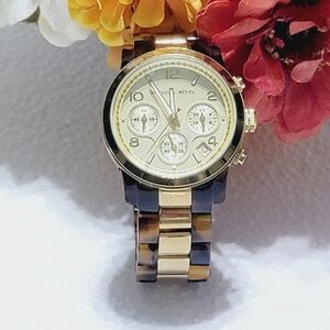 MICHAEL KORS WOMEN CHRONOGRAPH AND CALENDAR WATCH MODEL MK 5138 POLISHED GOLD TONE PHOSPHORESCENT HANDS STAINLESS STEEL NEED NEW BATTERY. USED BUT IN GOOD CONDITION.