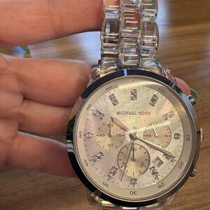 Michael Kor's Clear Acrylic Watch is PRE-OWNED but never worn No scratchs in great dcondition. Watch has silver bezel, hour markers, function buttons and Swarovski crystal hour markers with mother-of-pearl face. Three sub-dial chronographs for seconds, minutes and 24-hour information and window for the date. The watch is Japanese quartz movement and water-resistant to 330 feet.Watch comes with original box and original additional links that can be added. Also comes with original price tag and instruction booklet. This watch originally retails for $250.SizeCase Diameter: 43mmColorClearSilverConditionPre-ownedExcellent ConditionMeasurementsStrap Width: 21mmStrap Length: 7½"MaterialStainless SteelAcrylic Strap