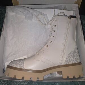 MICHAEL KORS Weiss Leather and Signature Logo Combat Bootie Faux Leather