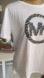 Stylish white t-shirt featuring a bold black logo design. Perfect for casual wear.