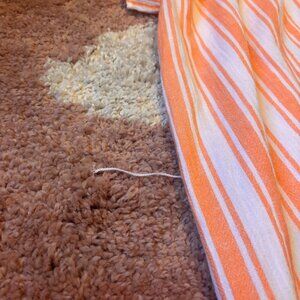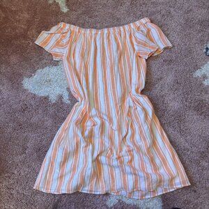 Embrace the effortless sophistication with the Michael Kors Women's Striped Flutter Sleeve Dress. This vibrant orange dress, sized large for a comfortable and flattering fit, is a stylish blend of cotton and linen, ensuring both breathability and durability. Its short flutter sleeves and off-the-shoulder neckline add a touch of whimsy to your look, making it perfect for a range of occasions from business meetings to cocktail parties. The dress features a playful striped pattern that continues into a fit-and-flare silhouette, celebrating the femininity of the design. It's fully lined for a seamless finish and includes smocked details for a touch of texture. Whether you're dressing up for an event or simply enjoying a day out, this dress is a versatile addition to your wardrobe, transitions seamlessly through spring, summer, and fall. $140 Retail. New with Tags! Missing belt & one belt loop isn't attached, as shown in photos. 33.5" Dress Length. 21" Pit-to-Pit.