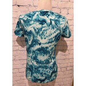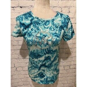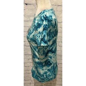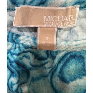 This is a women's size small blue and white tie-dye t-shirt by Michael Kors. It features a crew neckline, short sleeves, and a pullover closure. The shirt is made from a blend of cotton and modal, with silver stud MK logo accents. It is designed for casual or travel occasions, with a colorful theme suitable for the summer, fall, and spring seasons. 16 inches pit to pit and 23 inches long. Smoke free home.