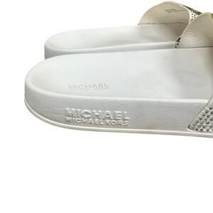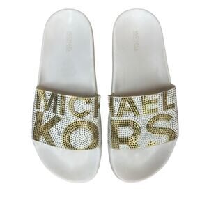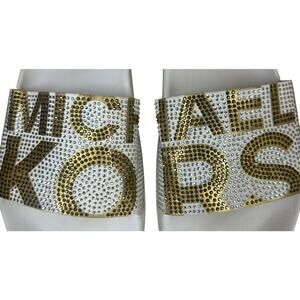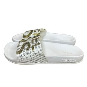 MICHAEL KORS Womens White And Gold Rhinestone Gilmore Slip On Sandals Slides Size 8M