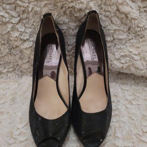 MICHAEL KORS YORK PLATFORM BLACK GLITTER PUMP OPEN TOE WOMENS SHOES Size 9