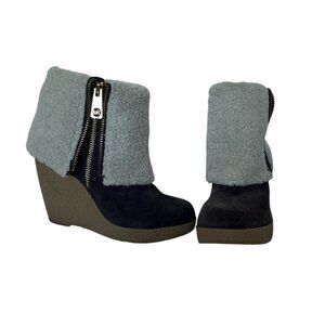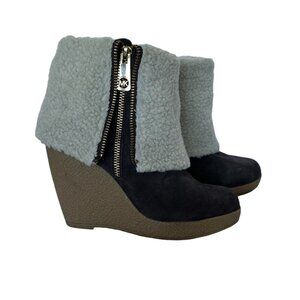 MICHAEL KORS booties Suede Fur Shearling cuff Wedge Bootie Gold MK Zipper 5 1/2