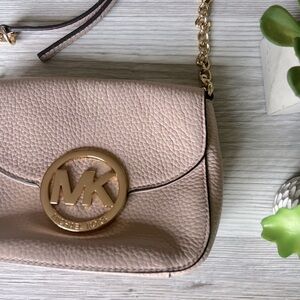 Michael Kors Fulton Small Crossbody bag. Pebbled leather. Dusty rose (light pink) color. Gold hardware. MK logo medallion on front. Flap opening with magnetic closure. Adjustable length strap. Lined interior. One interior pocket. One exterior pocket; magnetic closure, lined. Excellent preowned condition.