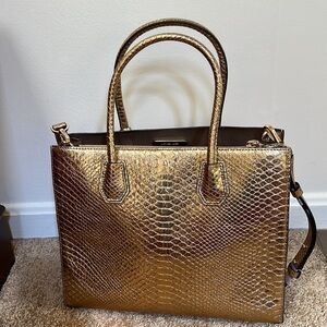 NWOT! Michael Kors gold metallic embossed satchel with crossbody strap. Strap drop 20” and adjustable upto 25”. Still has covering around zippers.