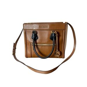 Preowned with some signs of wear/clean inside-estimated to be in production between 2010-2013, this medium Michael Kors satchel/tote showcases a sophisticated blend of brown and black, offering a timeless appeal. Its structured design ensures both style and practicality, making it a versatile addition to any wardrobe. Crafted with precision, this bag embodies elegance and functionality.
