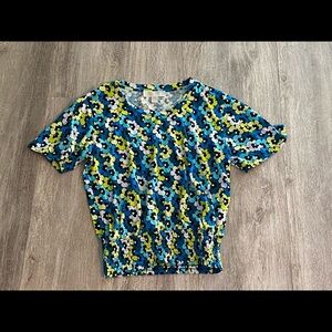 Neón tones highlight whimsical flowers bringing a playful vibe to MK smocked waist top