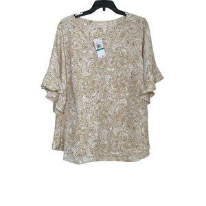 EUC MICHAEL KORS shortsleeved tie dye blue and white circle design with top zippered shoulders and ruched sides. Wash inside out in cold delicate; lay flat to dry. 95% cotton 5% elastane. Approximate Measurements (laying flat): bust: 17” length: 25” pit to cuff: 1.5” round neck