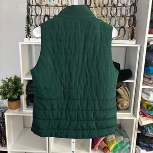 Stylish green quilted vest featuring a gold zipper. Perfect for layering.