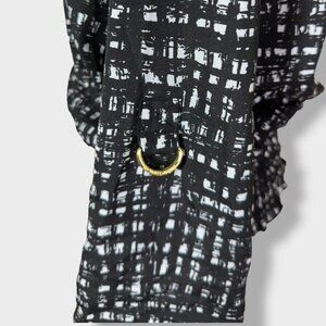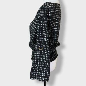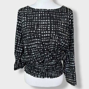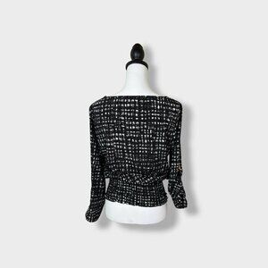 Michael Kors Black and White Smocked Waist Roll Tab Blouse with gold Size Small
