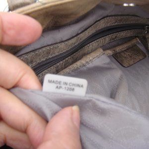 I LOOKED FOR CORRECT COLOR OF BAG BUT DIDN'T FOUND. I DID MY BEST TO SHOW THE COLOR OF THIS BAG. PHOTOS WHERE TAKEN OUTSIDE IN THE SUN LIGHT TO SHOW COLOR OF BAG. PHOTOS TAKEN INSIDE MAKE THE BAG COLOR A BROWN COLOR.PHOTOS SHOWN ARE VERY EXACT COLOR TO GOLD-TONE METALLIC.