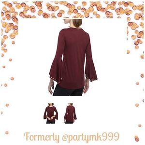Michael Kors Flutter Sleeve Top Features Round Neckline, shiny gold studs accent the flirty long bell sleeves a real fun addition to your closet. This head turning fluttery bell sleeves in beautiful merlot color will no doubt become one of your fav’s! Michael Kors signature gold tone bar accents top back side. Made of 55%cotton & 45%modal light stretch feels like cool tee top material hi-low double seam at bottom, machine washable👌🏼retails for $78 from Dillards, REDUCED CCO