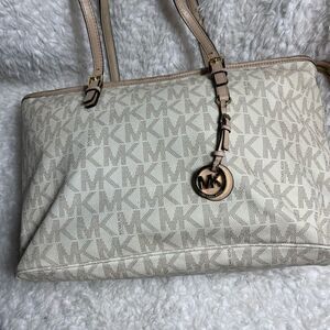 MICHAEL Kors Monogram cream textured gold monogram Tote beigeleather straps &trim top zipper the inside lining has a side zipper four side pockets middle zipper padded compartment.pre owned in good used condition some faded spots on the monogram prints see all pictures any questions please message B11