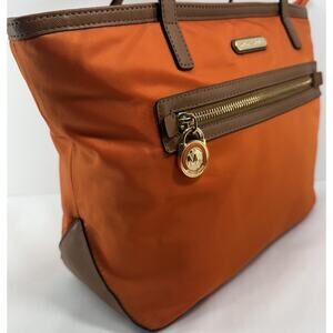 This is an authentic Michael Kors Kempton Large Nylon Tote in orange nylon with brown saffiano leather trim. Lightweight yet roomy, the Kempton is perfect for everyday wear, travel, or work.