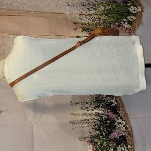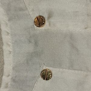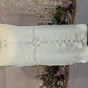 Wow factor on this one! Stunning gold hardware adorn this cream colored sleeveless Polyester Tunic. Crumpled effect material. Teenie pinhole in last photo from manufacturer. Not noticeable.