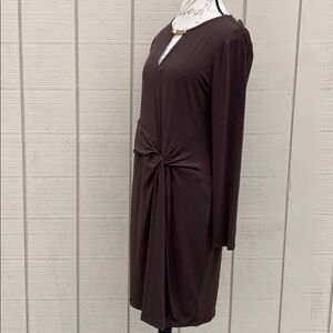 Chocolate brown long sleeve dress with side swept knot at hip. Key hole neck line with gold toned branded bar. Back zip with hook and eye closure. Unlined. 94% Polyester, 6% Spandex. Hand wash cold, flat dry.