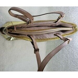 Michael Kors jet set signature tote bag Gorgeous glam gold MK signature tote bag beautiful gold inside and out large enough to carry anything you need gold protective feet gold hardware large gold MK emblem tan leather handles gorgeous bag has three inside sections middle section zips 4 inside slip pockets 1 side zipper pocket.2 Side Pockets.Leather Handle. Minimal Signs Of Use.Bag Is Still In Great Condition.Some Areas On The Handles Have Their Finishing Paint Peeled Off.