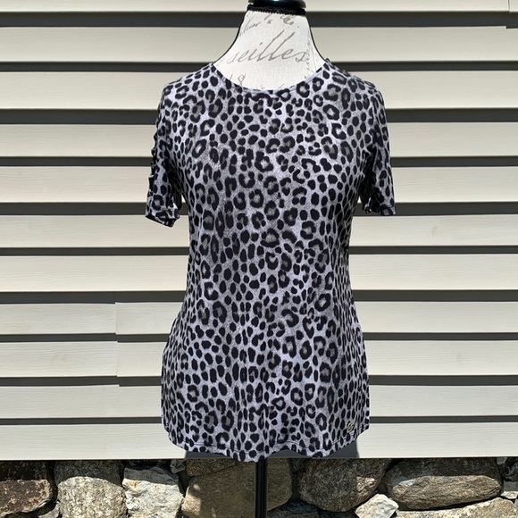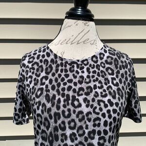 Unleash your wild side in this slinky super comfy gunmetal leopard print tee with cut out short sleeves. Side slits on hem. Silvertoned logo on bottom left.